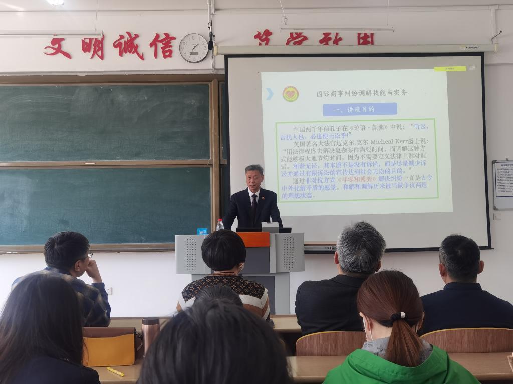 随着生产生活恢复正常,各类经济交往日益频繁,商事纠纷逐渐增多,争议解决途径亦呈现出多元化发展趋势。 当前,我国大力倡导非诉讼纠纷解决机制,其中商事调解因其便利快捷、成本低廉、 等特点,已经成为与仲裁、诉讼并列 的独立解决纠纷方式,日益受到当事人青睐。为了让同学更加深入地了解国际商事纠纷调解。法律系于4月12日邀请了哈尔滨市非诉讼服务中心、民商事调解中心主任王源泉为全系师生做了题为《国际商事纠纷调解技能与实务》的讲座。