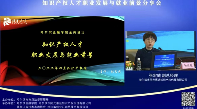 随后由哈尔滨市阳光惠远知识产权代理有限公司副总经理张宏威女士进行了以“知识产权人才职业发展与就业前景”为主题的分享,从行业发展、国家发展规划、知识产权公司发展变化、市场需求等方面,结合自身的从业经历让同学们深入了解了知识产权行业。