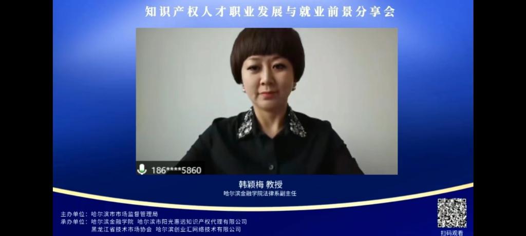 法律系副主任韩颖梅教授在分享会上介绍了哈尔滨金融学院基本情况以及知识产权专业的人才培养目标、专业优势及特色和就业发展情况。她指出今天的青年将是明天的发明家、创造者和企业家。世界各个地区的青年都在用他们的创造力和聪明才智推动变革,开辟通往更美好未来的道路。哈尔滨金融学院知识产权专业作为我省首家设置的知识产权本科专业,不但开创了我省知识产权本科教育的先河,填补我省知识产权本科教育的空白,还在专业建设和人才培养成果方面取得了丰硕的成果,为知识产权行业输送了大量的高素质应用型人才,满足了知识产权服务龙江地方经济发展的需求。